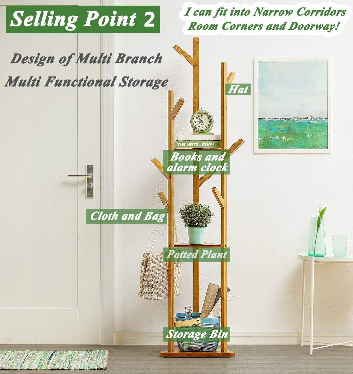 ADA Handicraft Bamboo Tree Garment Clothes Coat Hat Umbrella Portable Hanger Stand Rack with 3-Tier Storage Shelves and Hooks (L: 15.7 x W: 12.9 x H: 66.9 Inch)