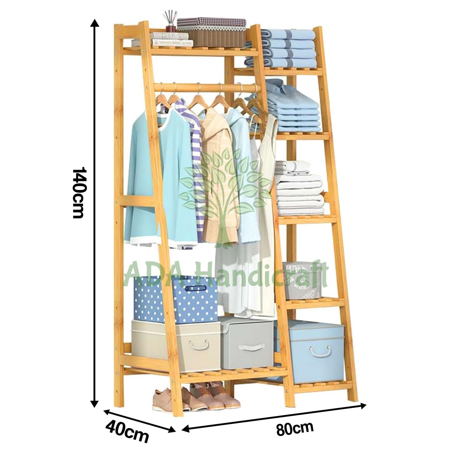 ADA Handicraft Clothes stand rack with 7 Storage compartments, plus 1 hanging area, meets for daily usage. Freestanding coat rack, lightweight, is easy to move at will; Only 0.3 M2 contact area. Compared with other wood upright garment racks, ladder standing clothes rack is more advantageous with its large ground contact area, bearing capacity, and stability.