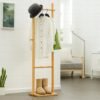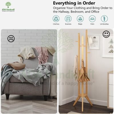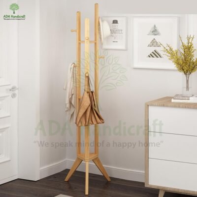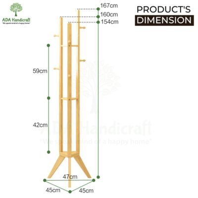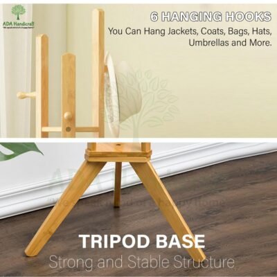 ADA Handicraft Premium Bamboo Stand for Clothes Bag, Scarves, Hat, Umbrella with 6 Hooks & 3 Shelf Triangular Base Coat Stand Corner Shelf Wooden Furniture dress hanger (45 x 45 x 167) CM