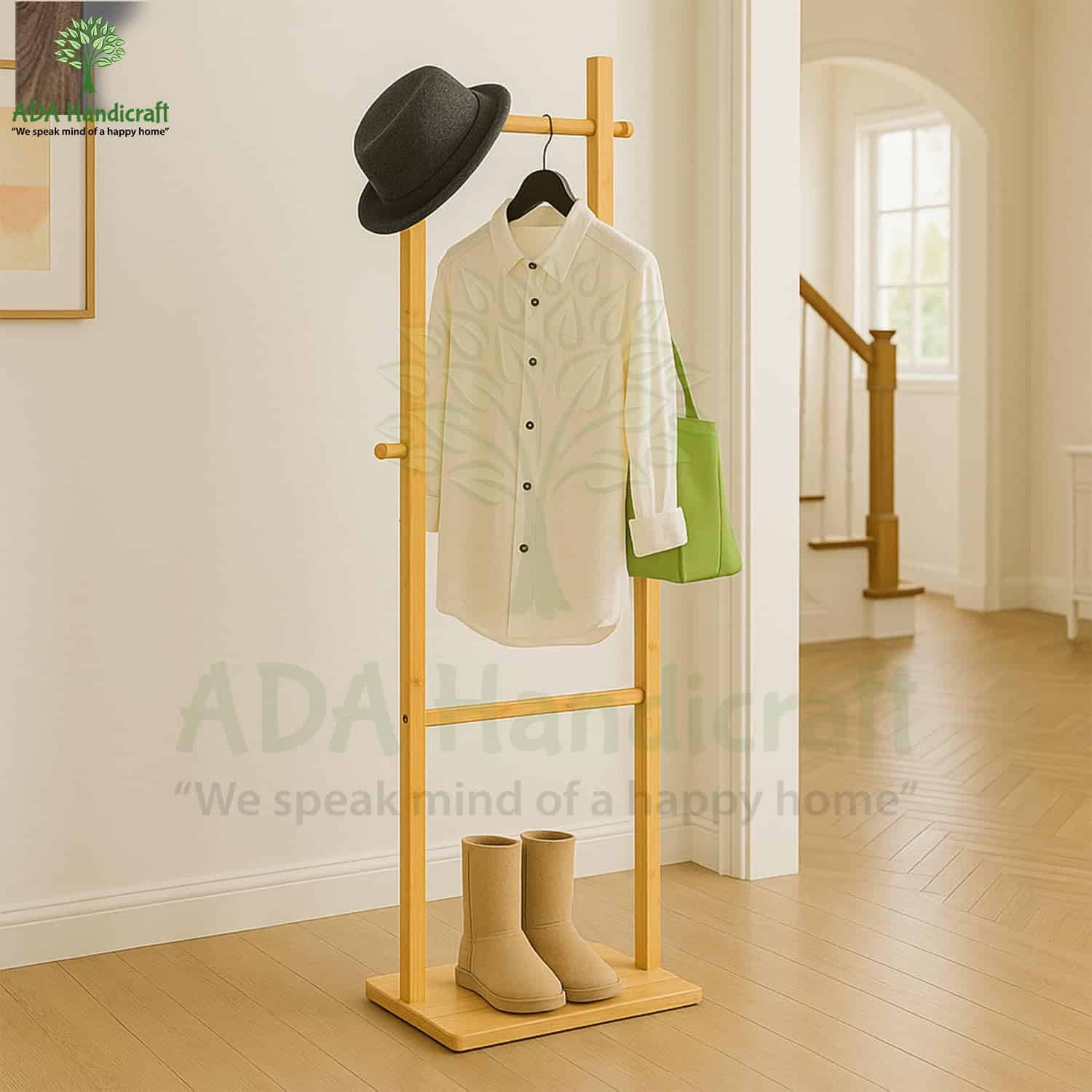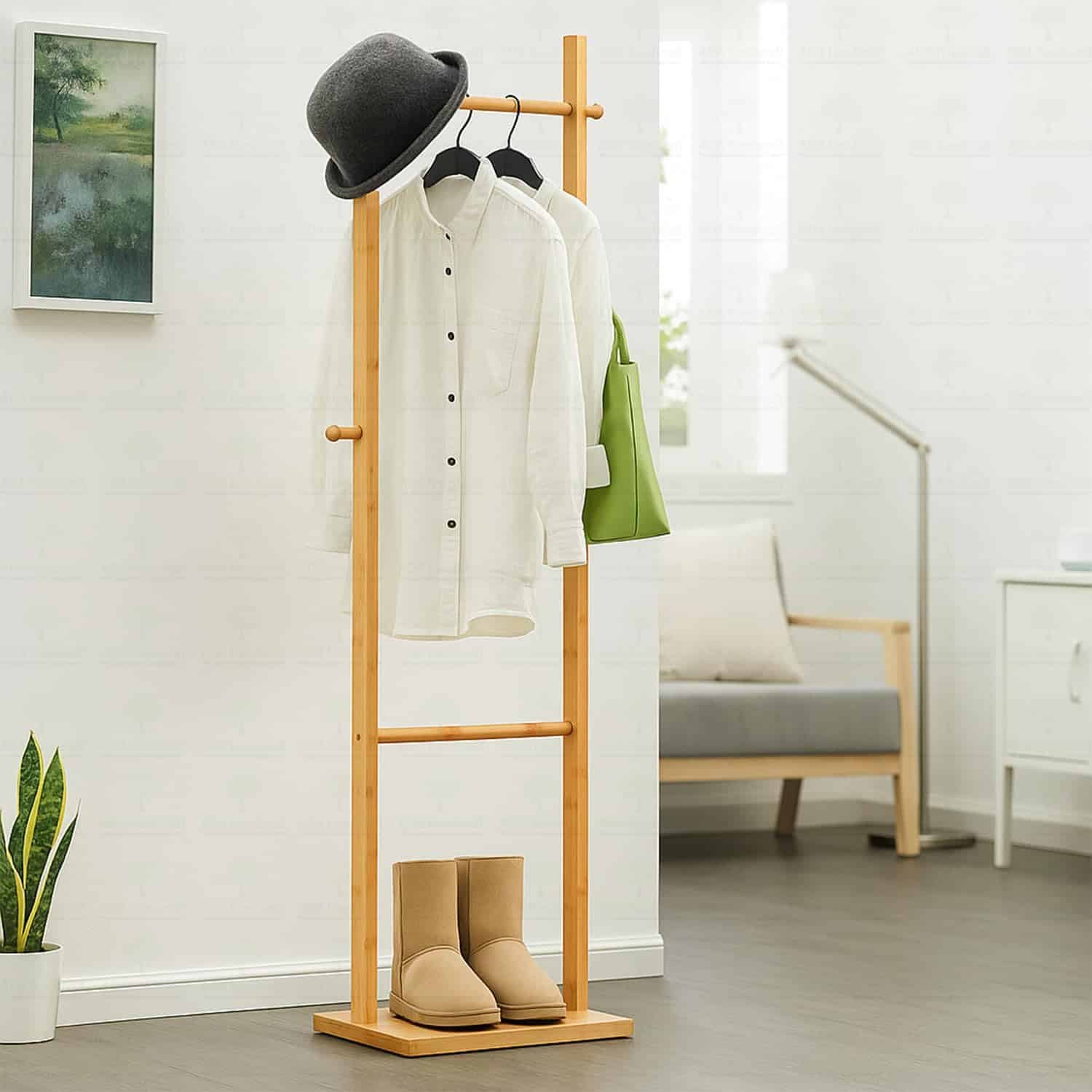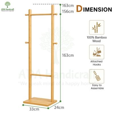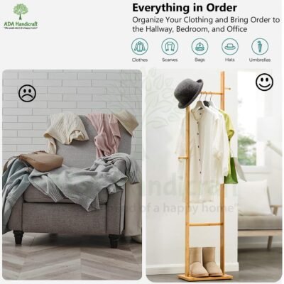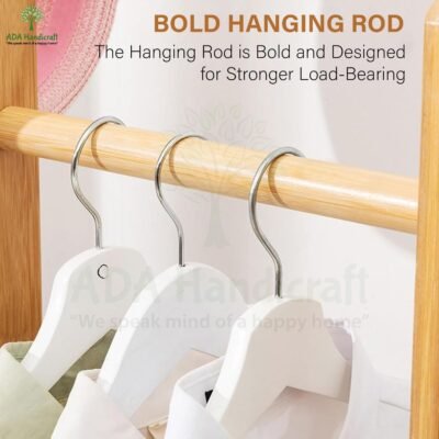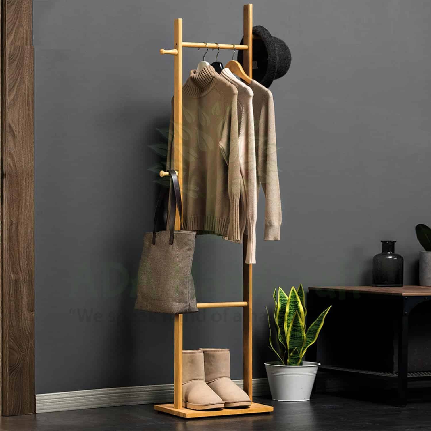 Multi-purpose hanging stand for home: Versatile corner rack works as a clothes hanger, bag stand, or accessory display. Slim bamboo design fits apartments, bedrooms, and entryways.