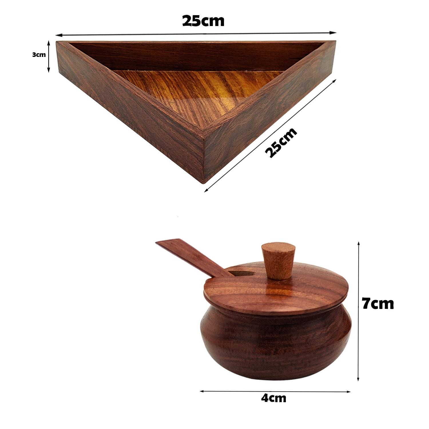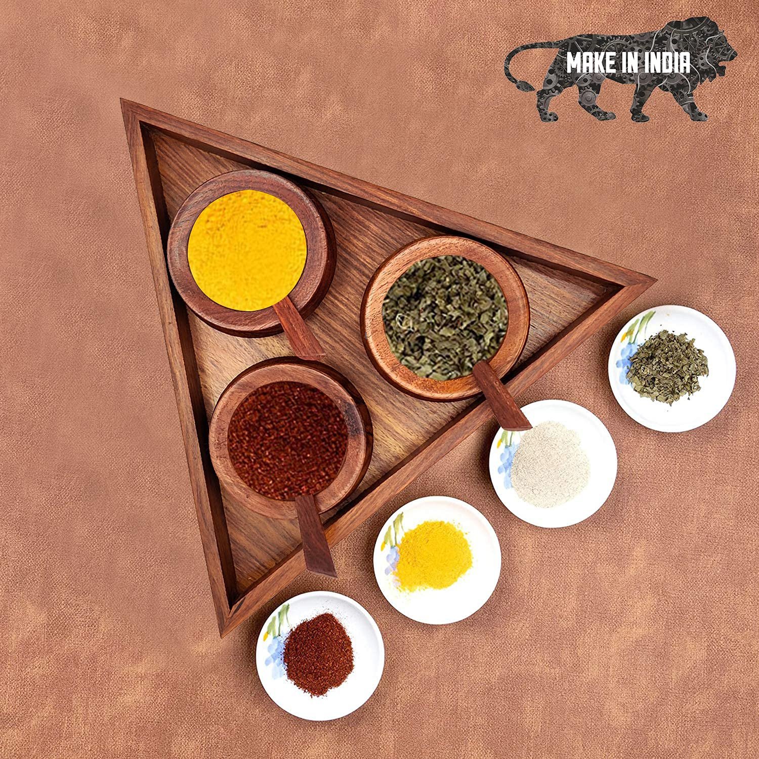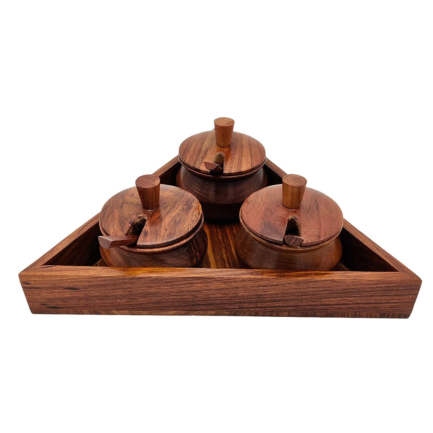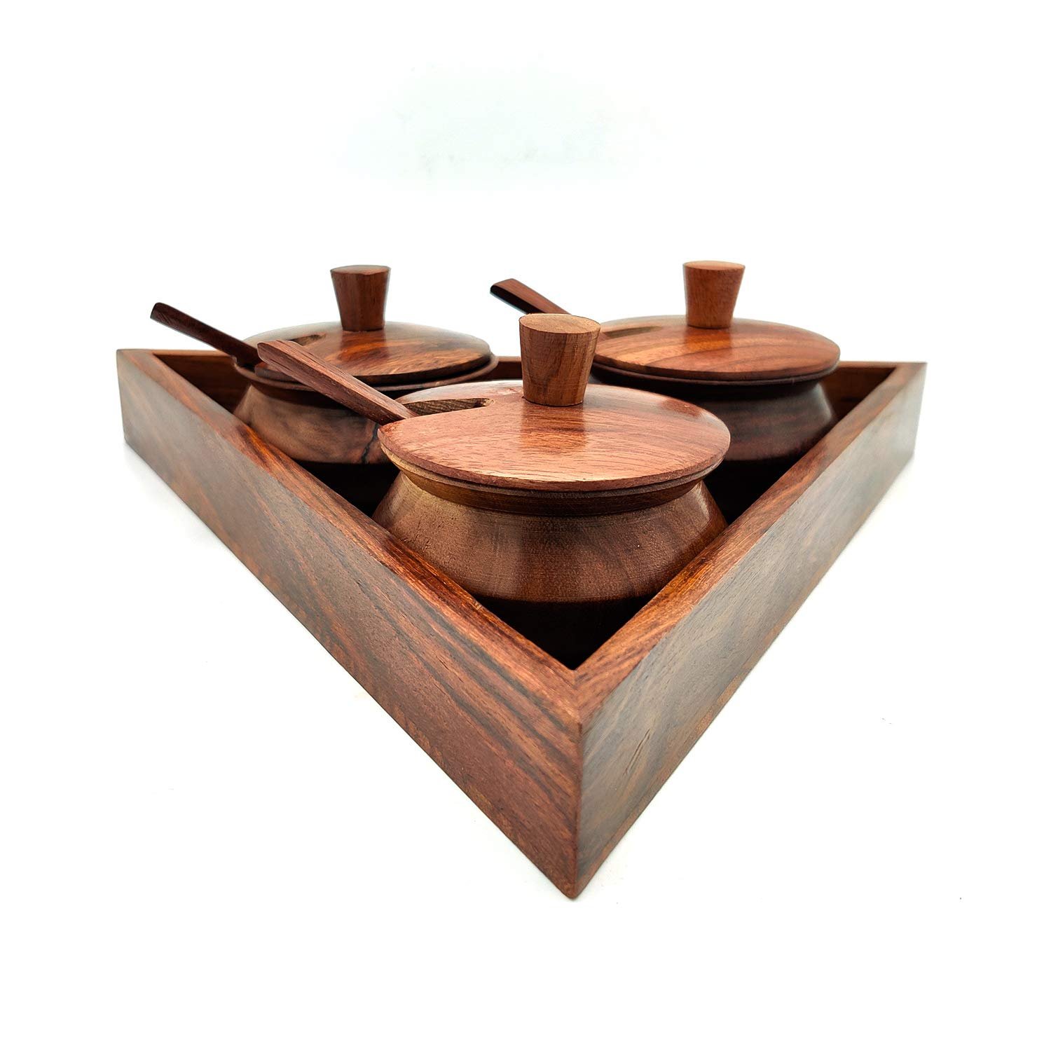 ADA Handicraft Saharanpur Artisans Sheesham Pakka Wood Triangular Wooden Jars Set with Tray and Spoon (50 ml ) – Condiment saunf supari Masala Container Mukhwas Tray Set