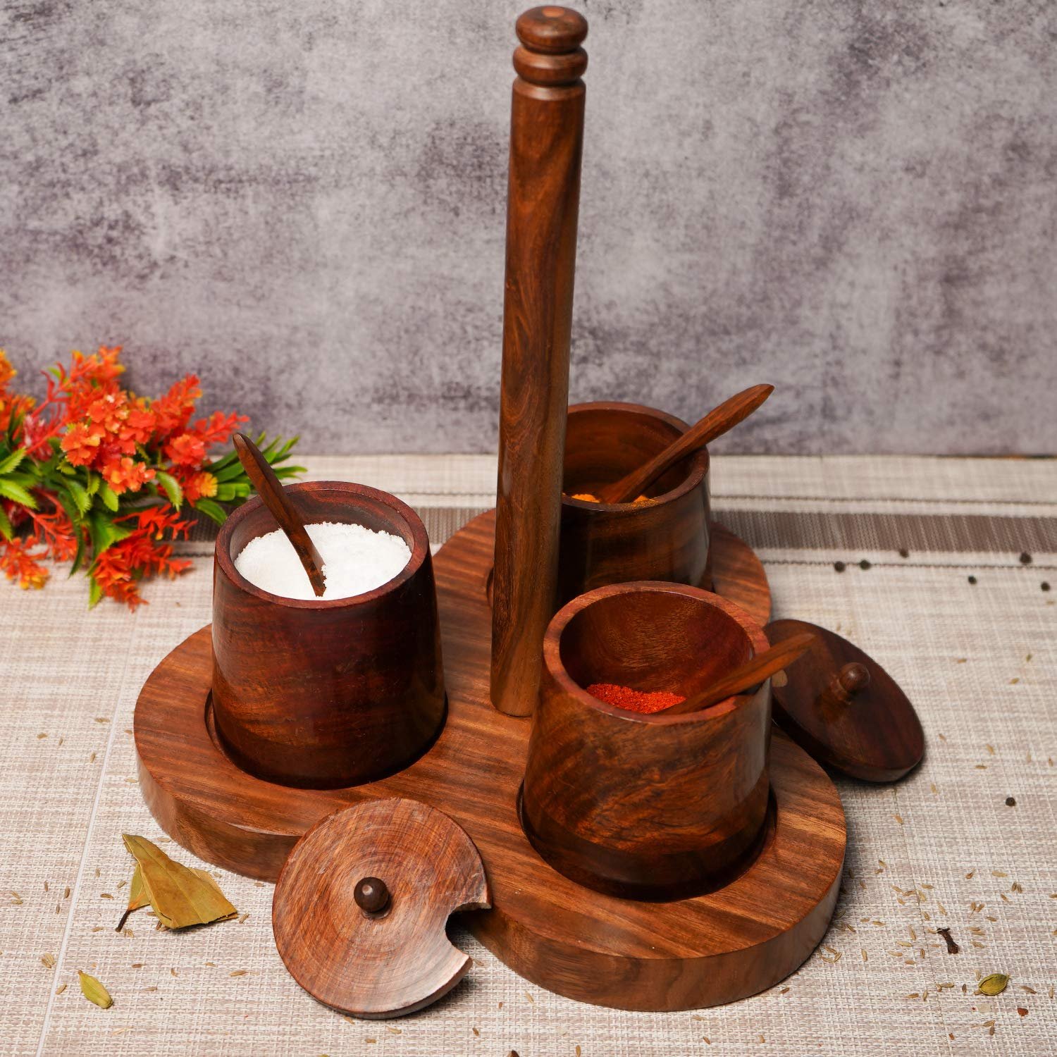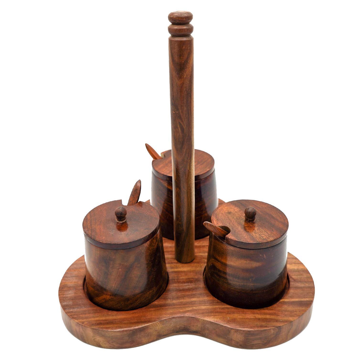 1 review for ADA Handicraft Sheesham Wooden Masala Jar With Stand, Spinning Countertop Herb and Spice Rack Organizer with 3 Jar, Spice Jar Set With Lid and Spoon – Size (26 x 26 x27cm)