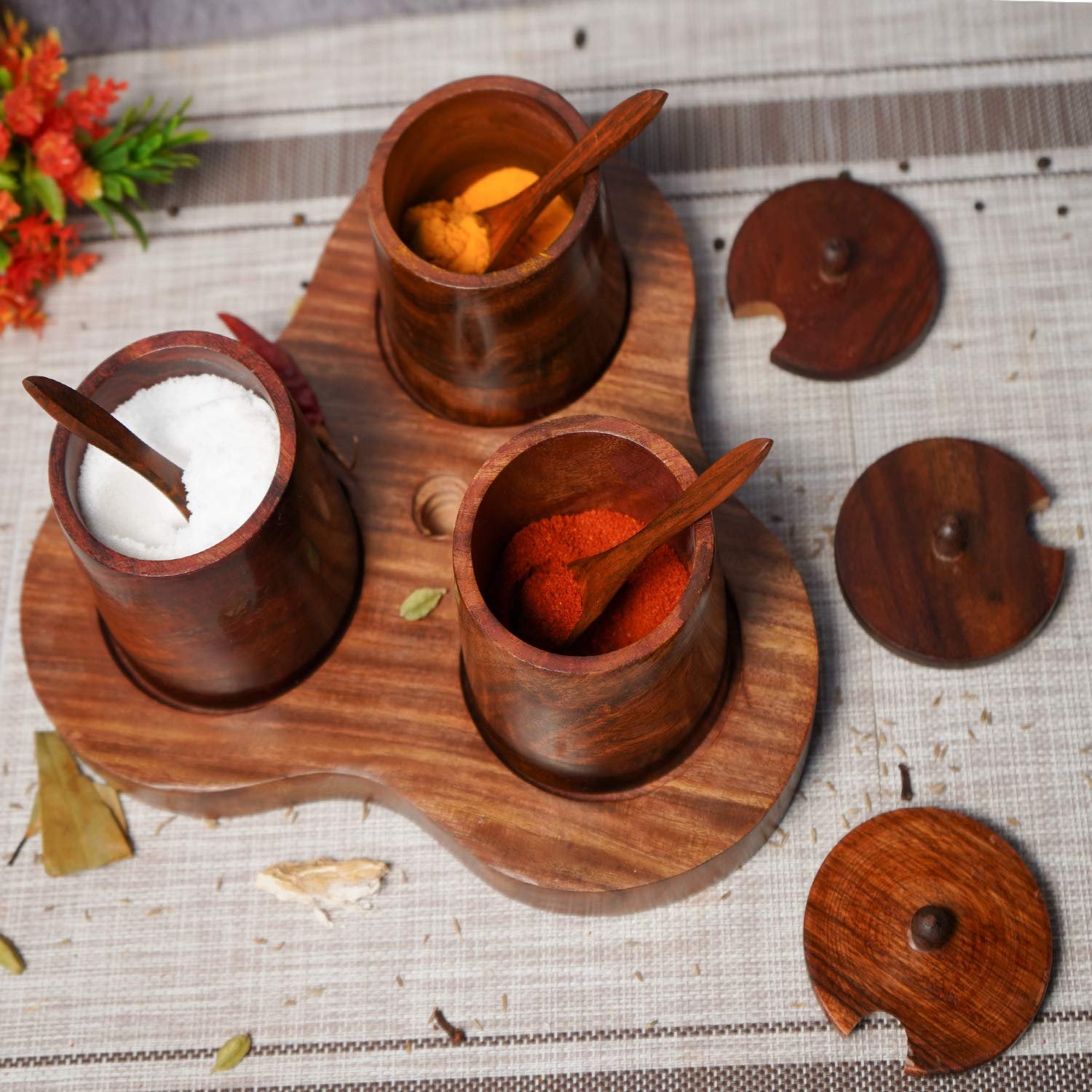 The traditional design is very appealing and eye-catching as an office desk table decor items home decor item. Three small wooden containers with lids and spoons, together with a long stand holding them together