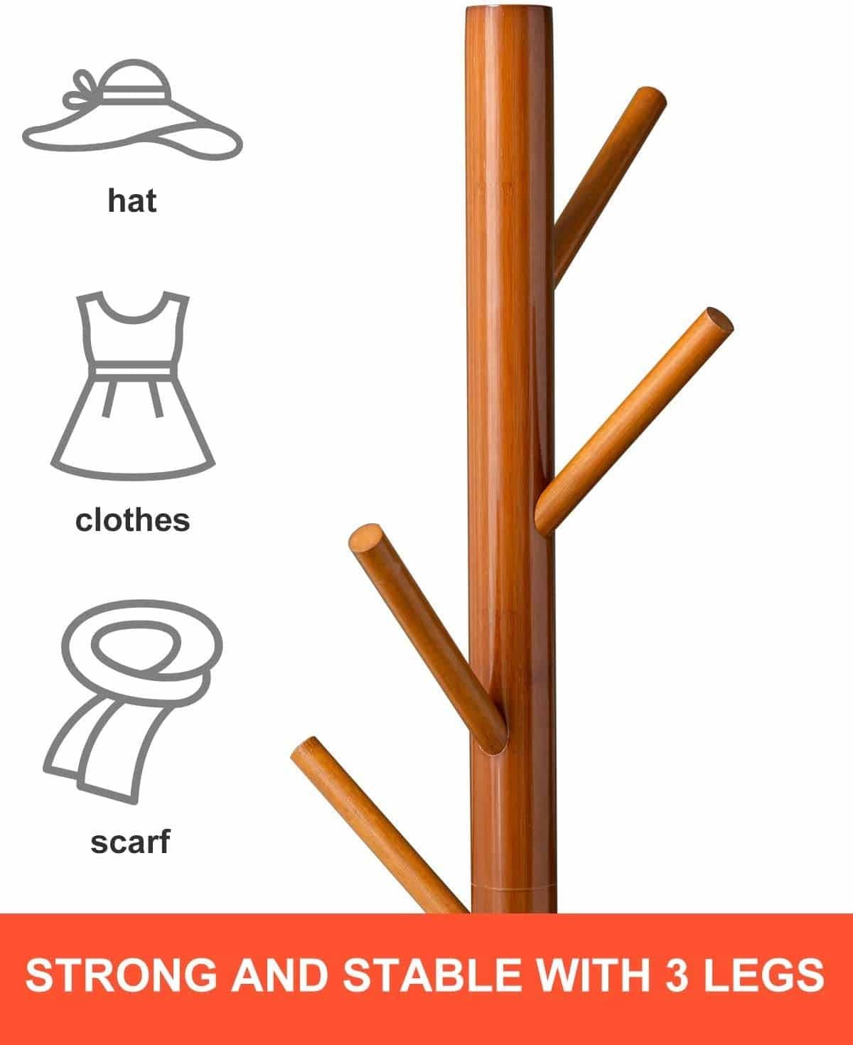 Special Feature ‎8 Convenient Hooks, Sturdy, 3 prong legs add balance and stability to the coat rack stand ensuring it won’t tumble when apparel is hung. Our reliable hall tree works and looks great in the home, business or office.