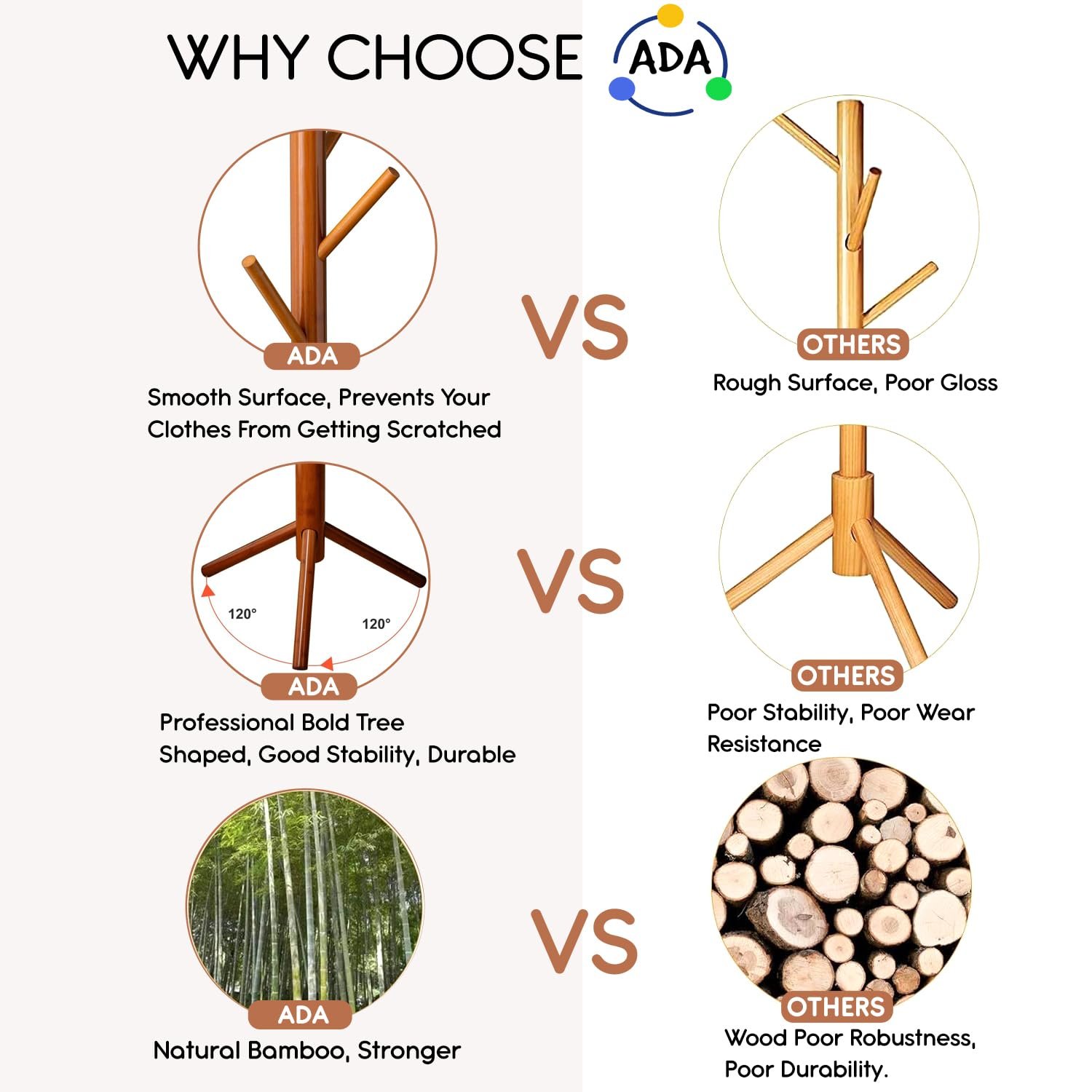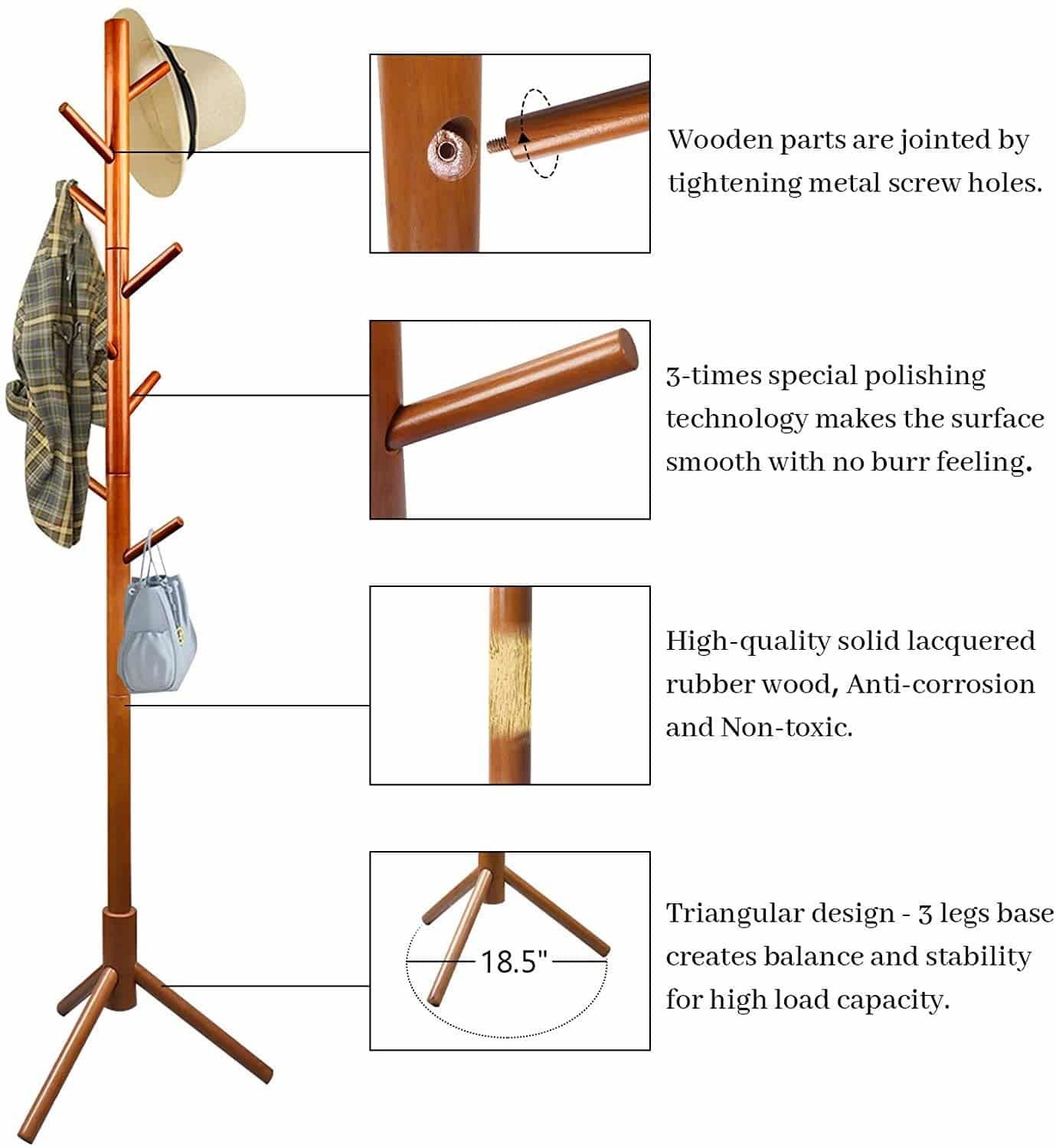 • 【MODERN & CHIC LOOKS】: With classic and vintage tree design, ADA Coat Rack Stand that would fit well in home, office, entryway, entry hall, bedroom, apartment, hotel and more! This Free standing coat hanger is made by real wood coated with environmentally friendly lacquer, which is waterproof, anti-corrosion and non-toxic.