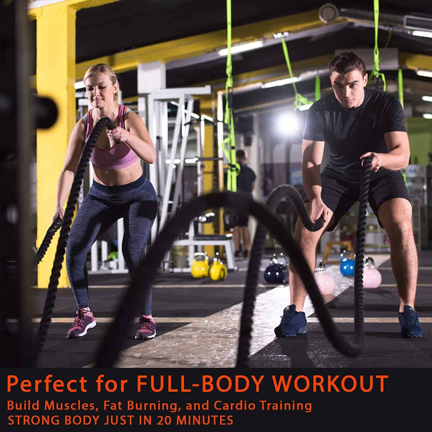 - FOR FULL BODY EXERCISE: Battling ropes provide effective resistance to work out the back, arms, shoulders, core, and legs. The combat rope is also great for cardio, producing a good sweat within minutes.