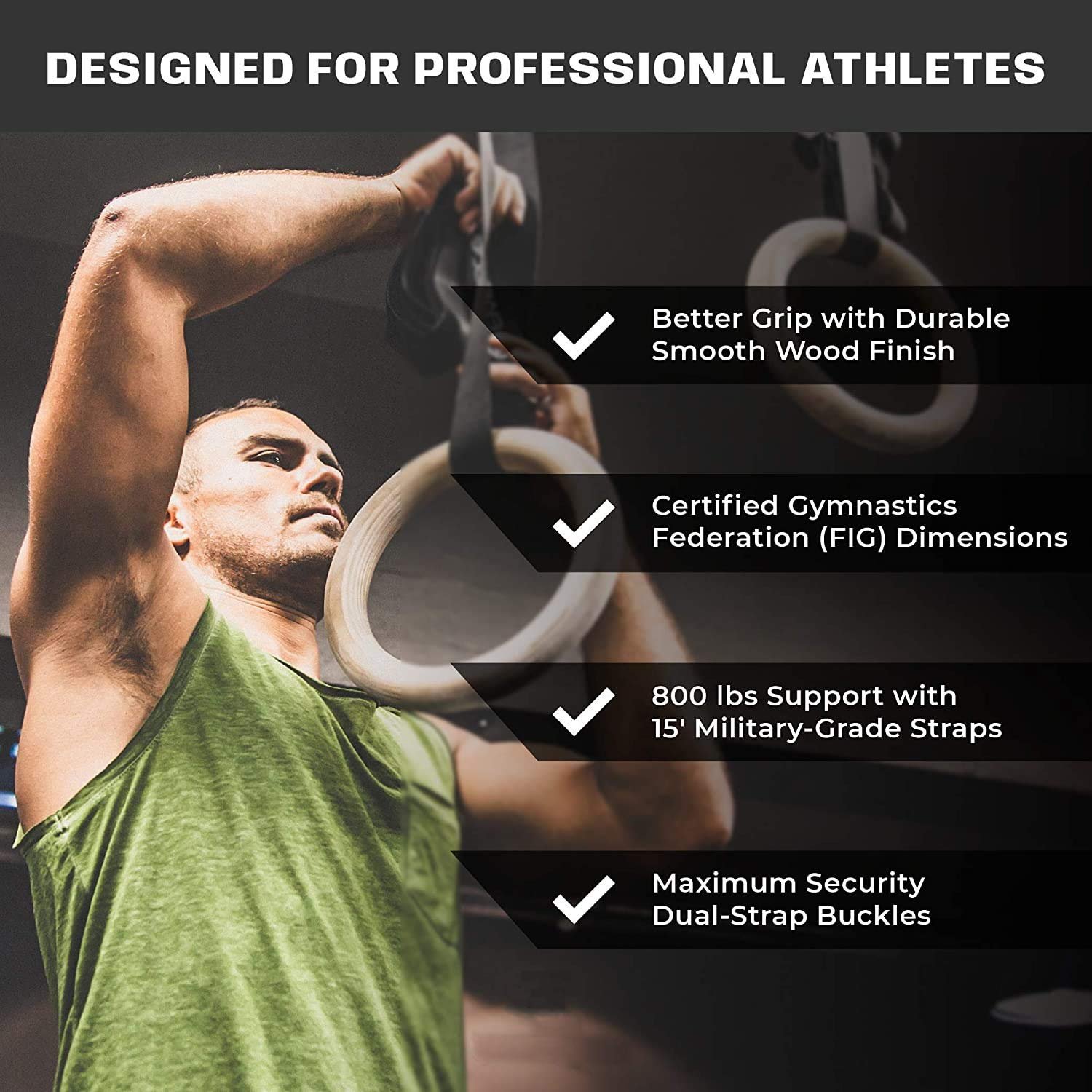 Wearslim Fitness Gymnastics Rings, Roman Ring 100-120 kg Capacity with 14.5ft Adjustable Buckle Straps for Cross Fitness Functional Training for Home Gym Full Body Workout – Wooden
