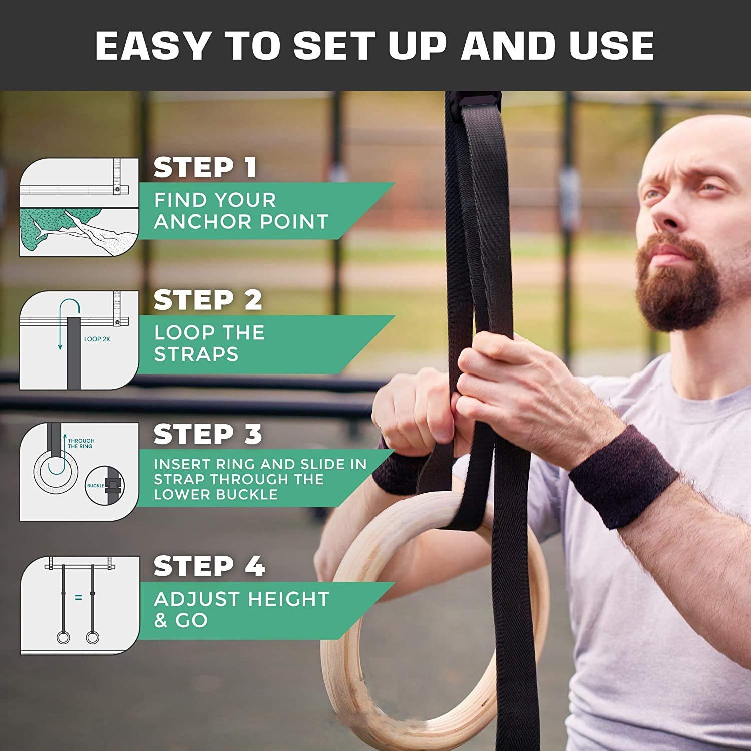 Specifically designed and manufactured so that all users can easily complete installation in less than 5 minutes, just hang around any solid piece of wood or steel, slide in the sling underneath the buckle, and find the appropriate strap length for you, then you are good to go.