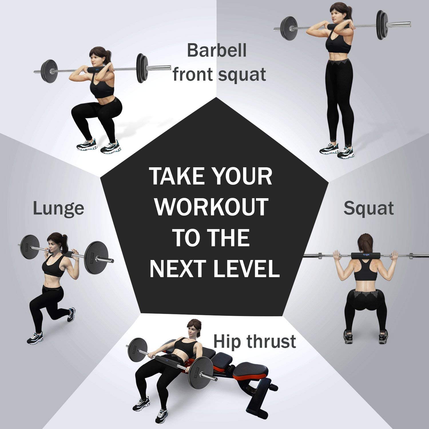 Barbell Bar Pad, Comfortable Barbell Sponge Pad for Hip Thrusts, Squats and Lunges The Barbell Squat Pad reduces discomfort to allow you to workout longer, and with more weight- increasing your gains! Ergonomic design relieves pain and pressure on your neck, shoulders or hips during exercises like Squats, Lunges and Hip Thrusts Thick, high density, non-slip rubber-foam squat sponge absorbs impact and reduces pain Quickly